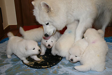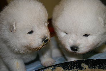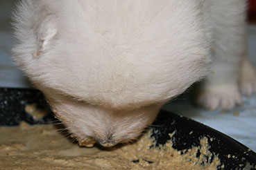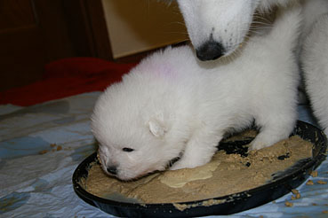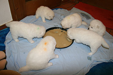 Auch gab es bereits das 1. richtige Welpenfutter und die Kleinen nehmen diese Nahrung gerne und mit viel Appetit an.