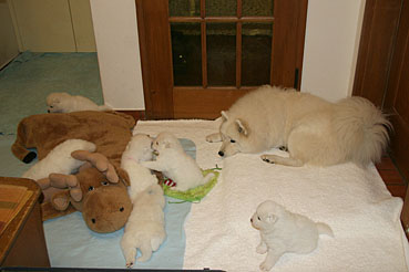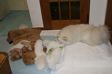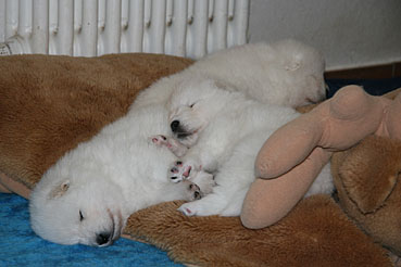 Die Motorik der Welpen wird von Tag zu Tag besser, sie erkunden auch schon die ersten Spielsachen, und ihre Geräusche sind schon sehr differenziert.