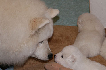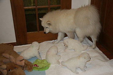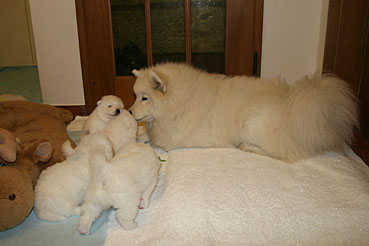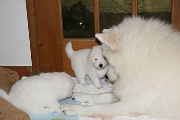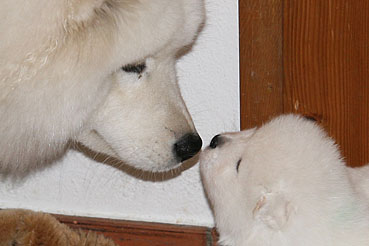 Bis anhin durften nur Beryll, Suka und Yuniq zu den Welpen aber Race gab Zora unmissverständlich zu verstehen, dass sie den Welpen fern bleiben muss. Dies ist nun anders, Auch Zora hat nun von Race die Erlaubnis, zu den Welpen zu gehen. Zora geniesst die in vollen Zügen und obwohl sie sonst unser "Wildfang" ist, verhällt sie sich bei den Welpen sehr vorsichtig und liebevoll.